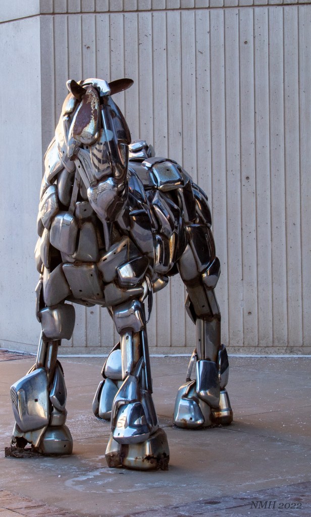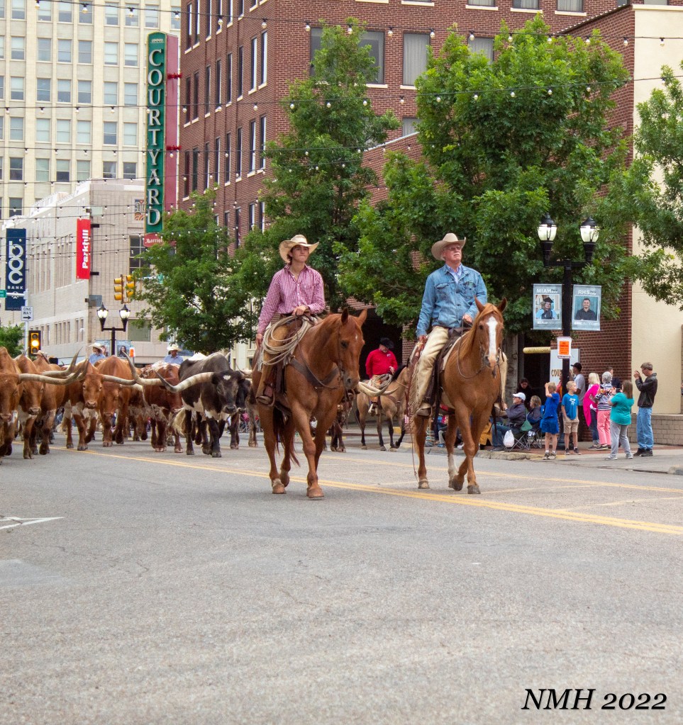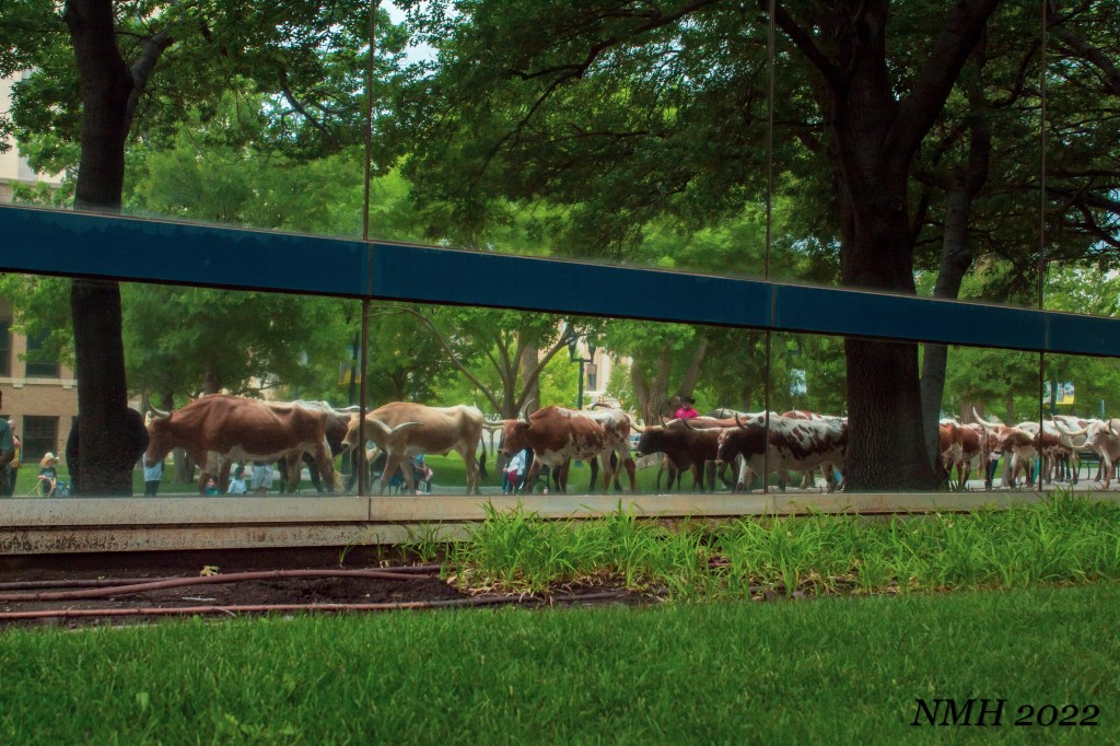 I enjoy this parade and taking pictures, but it is difficult to get what I have pictured in my mind’s eye sometimes. I had a couple of goals for this parade. I wanted some reflection pictures in the mirrored walls of the Amarillo National Bank building, a decent shot of the old brindle steer with one broken horn and try to just get lots of traveling longhorn legs.