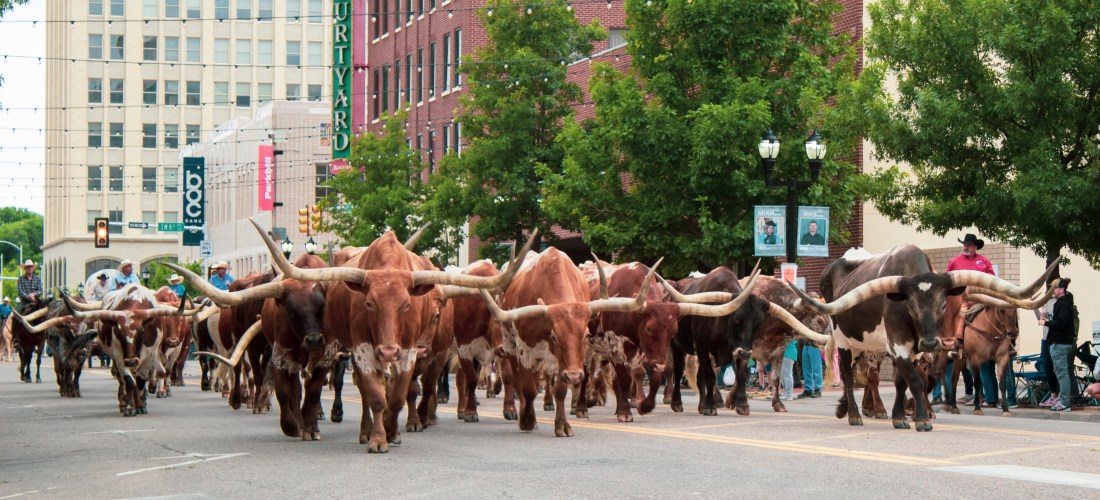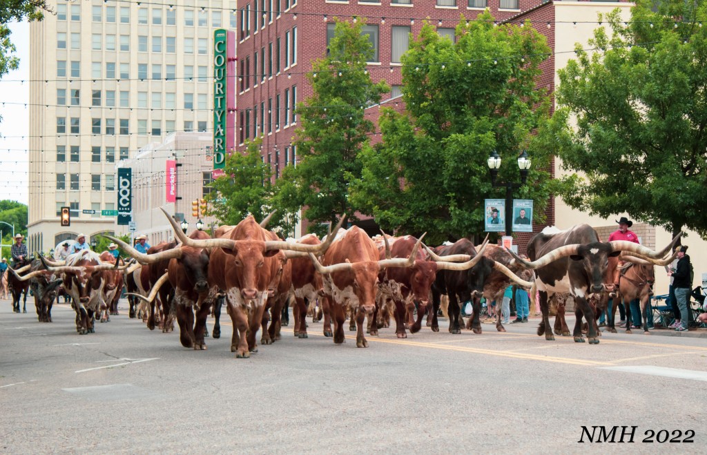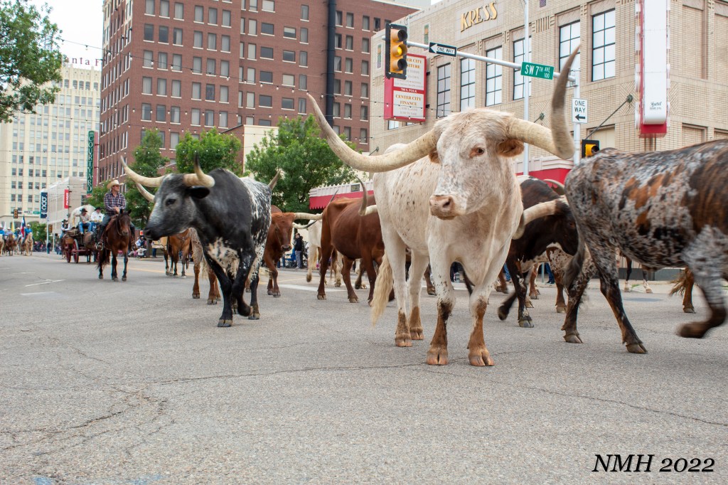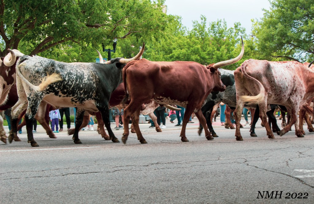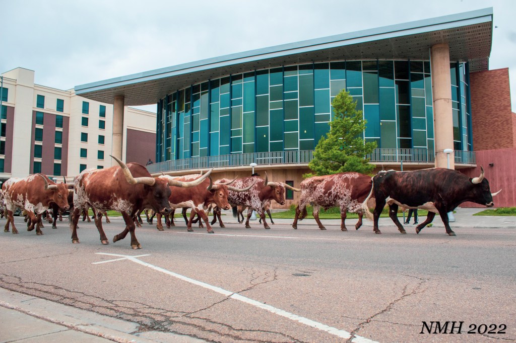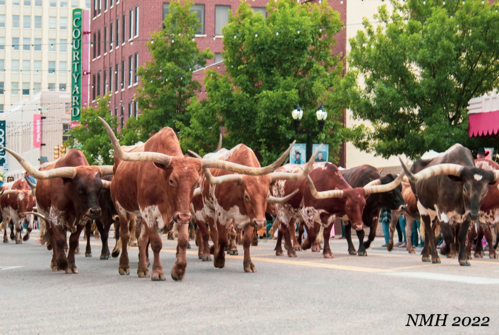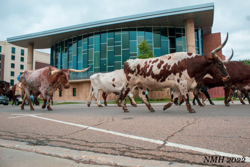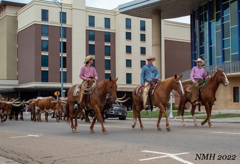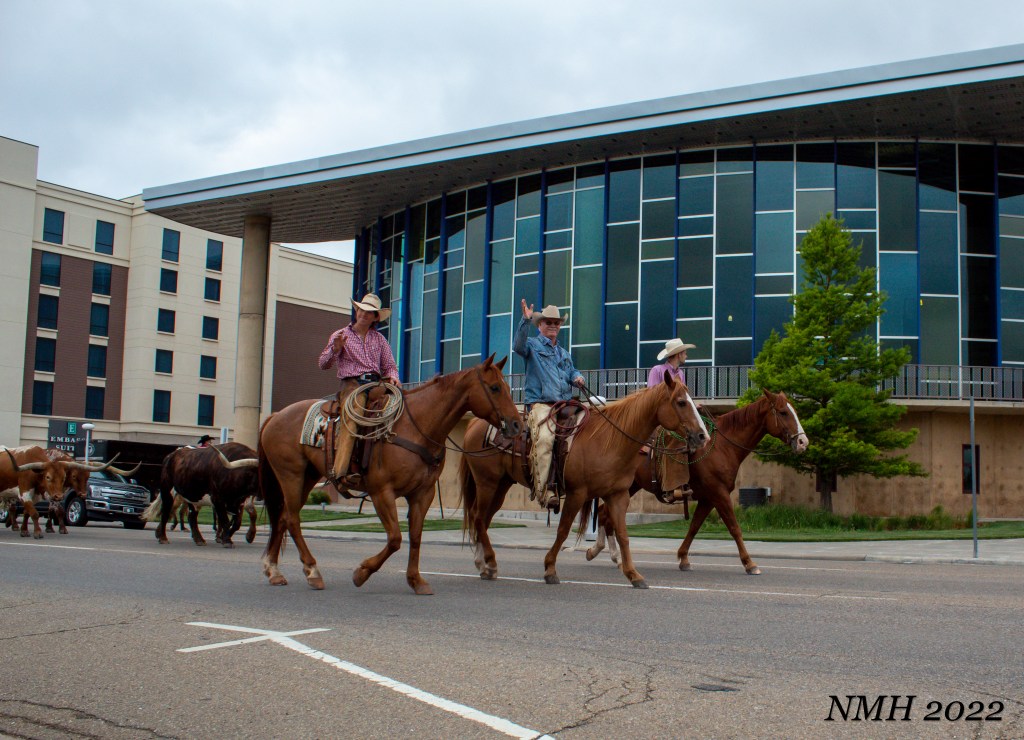Longhorn Cattle are driven through downtown Amarillo before the start of the annual Coors Cowboy Club Ranch Rodeo. It is a sight to behold. They don’t put up barricades or close off streets or intersections for this parade. Just a group of motorcycle law enforcement officers leading the way with lights flashing. They are followed by a chuckwagon pulled by a couple of gorgeous mules, the lead riders, the longhorn herd and those fortunate enough to ride drag behind the behemoths of bovine beauty.