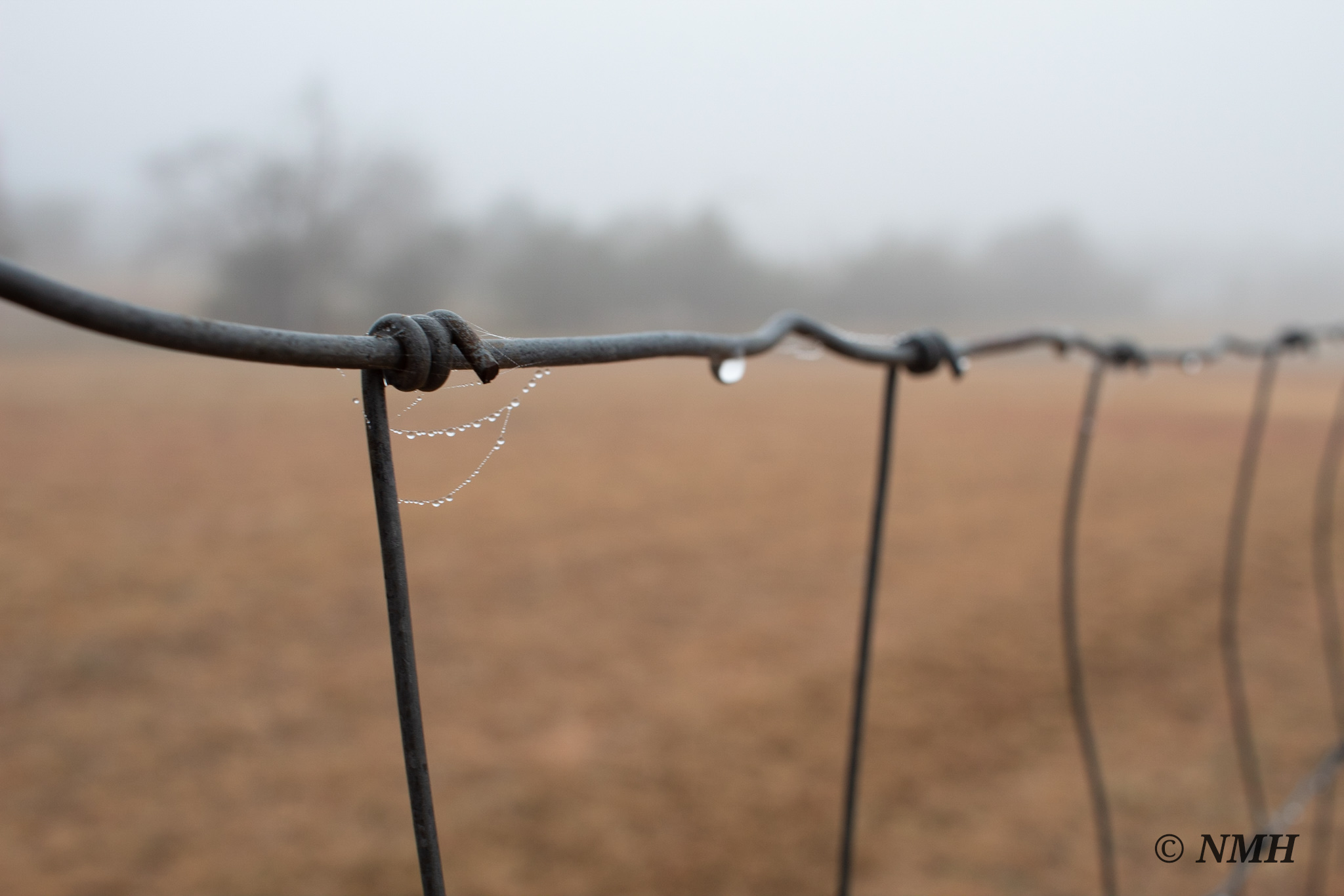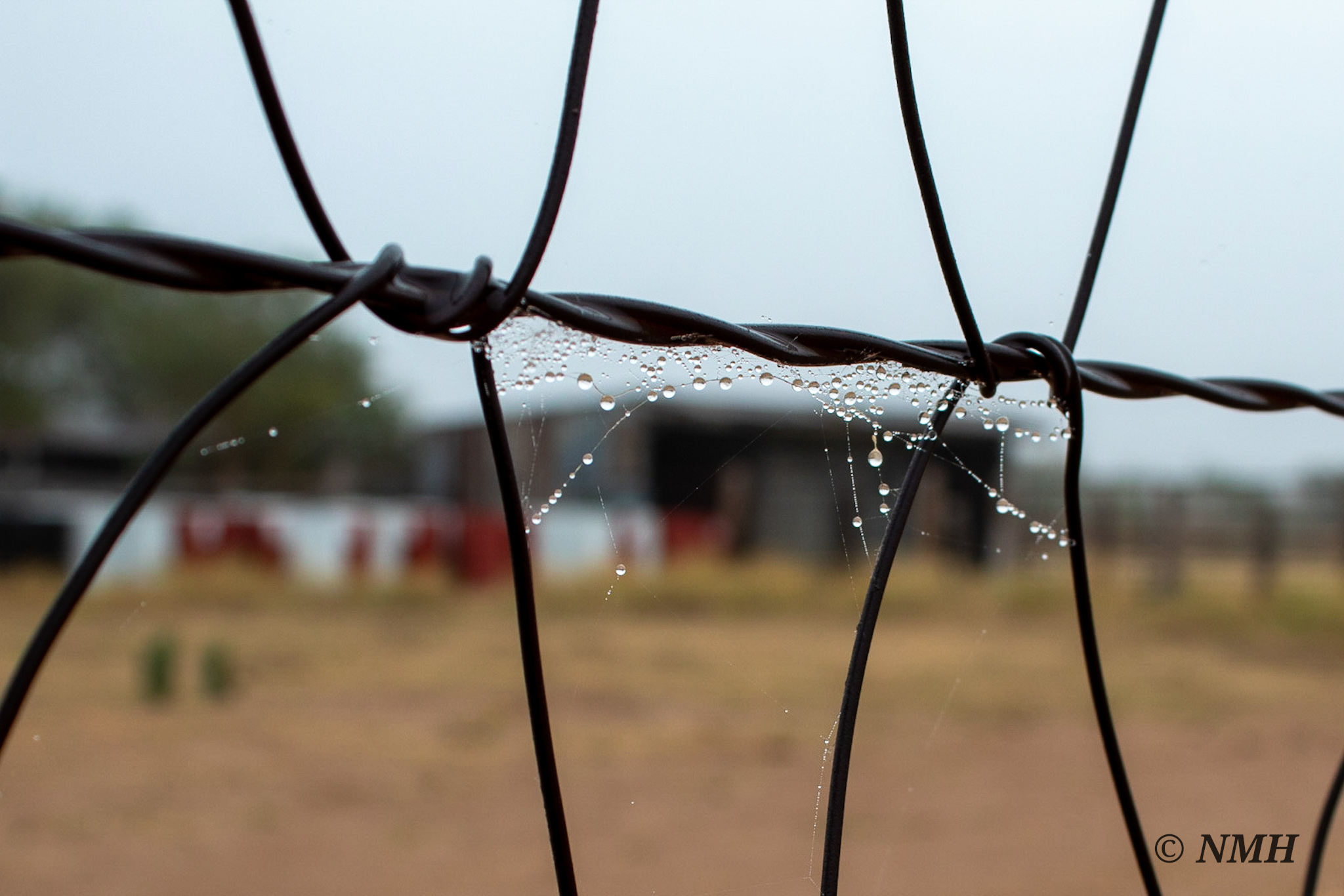 I always save the best for last…This picture is my favorite of the group. The dark twist of the old fence wire, the many threads of web intersecting with teensy, droplets of dew collected on nearly all of them, the old tin shed blurred in the background. One large drop in the center.
