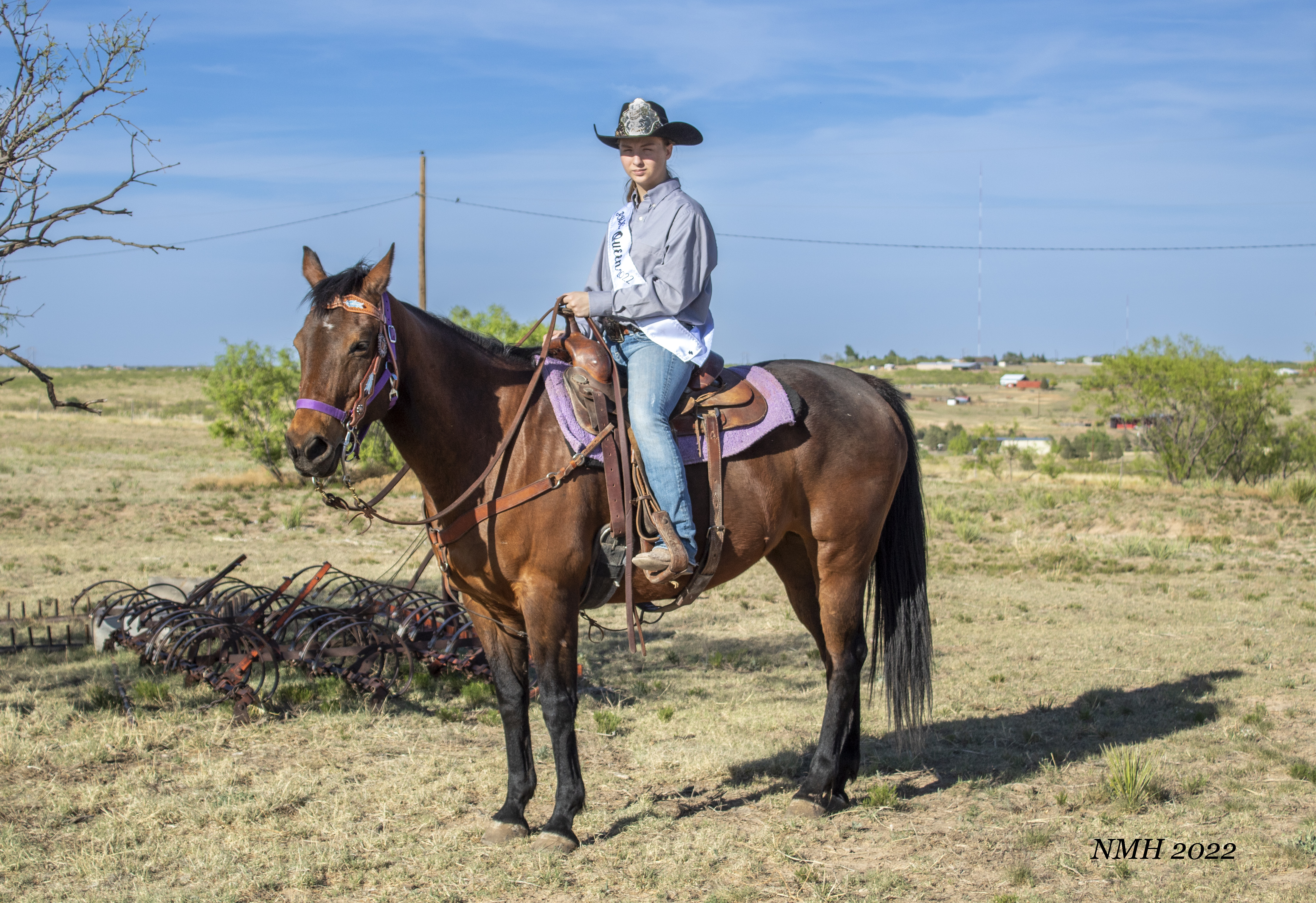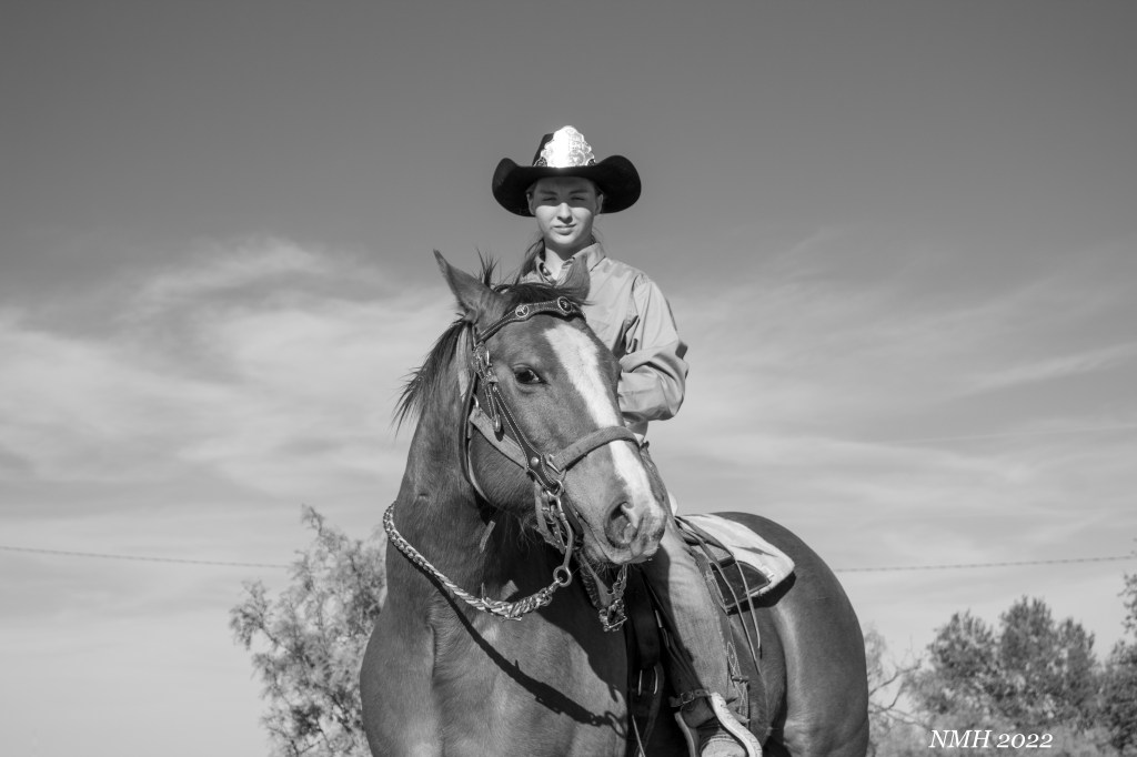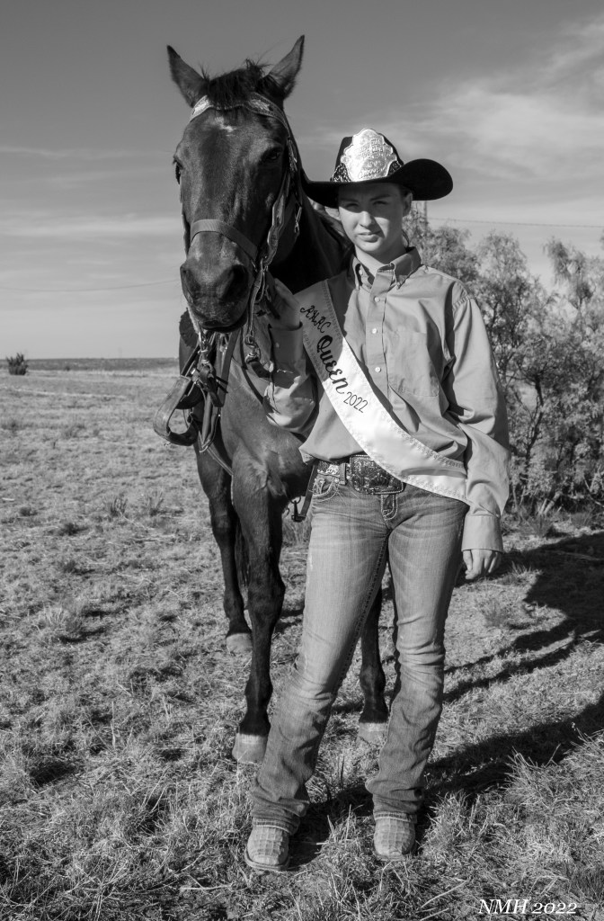 The things that were right about this session were, great subjects! She was eager to take some pictures, was comfortable and relaxed, and her horses were well behaved and easy to get into poses. The location suited the session as well. We had some farm equipment, some mesquites and a nice big elm tree for backgrounds the foreground was clutter free and we had a couple of hills and low spots to try and get level or below the subjects for a few interesting shots. I also think I captured her “true self”, I just let her be who she was. No forced smiles, we made a few suggestions on poses, and she took those suggestions and made them her own. You can tell she has a relationship with her horses, they are just as relaxed and easy going as she was. I ended up with quite a few photos where the horses’ eyes were closed because they were just chill.