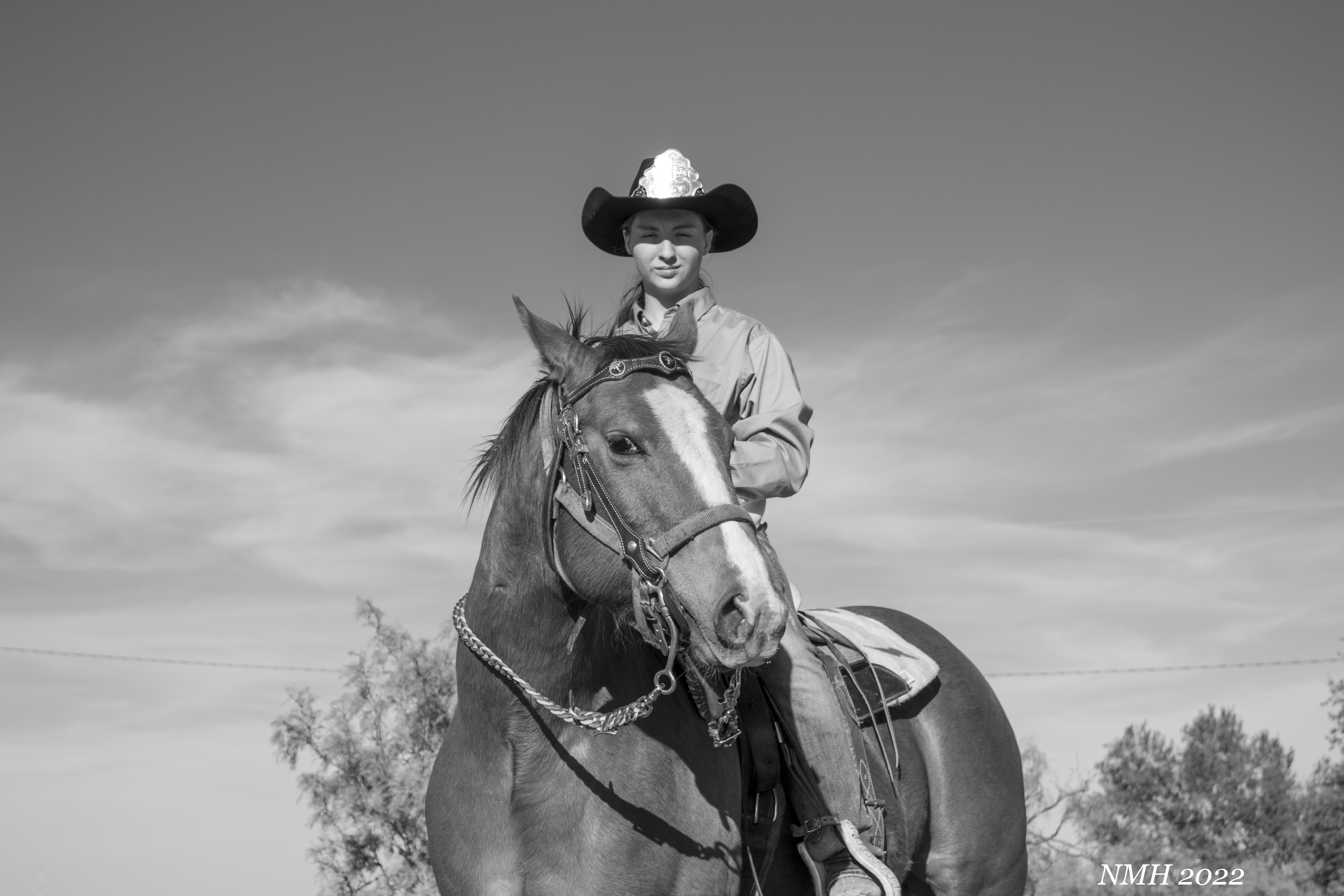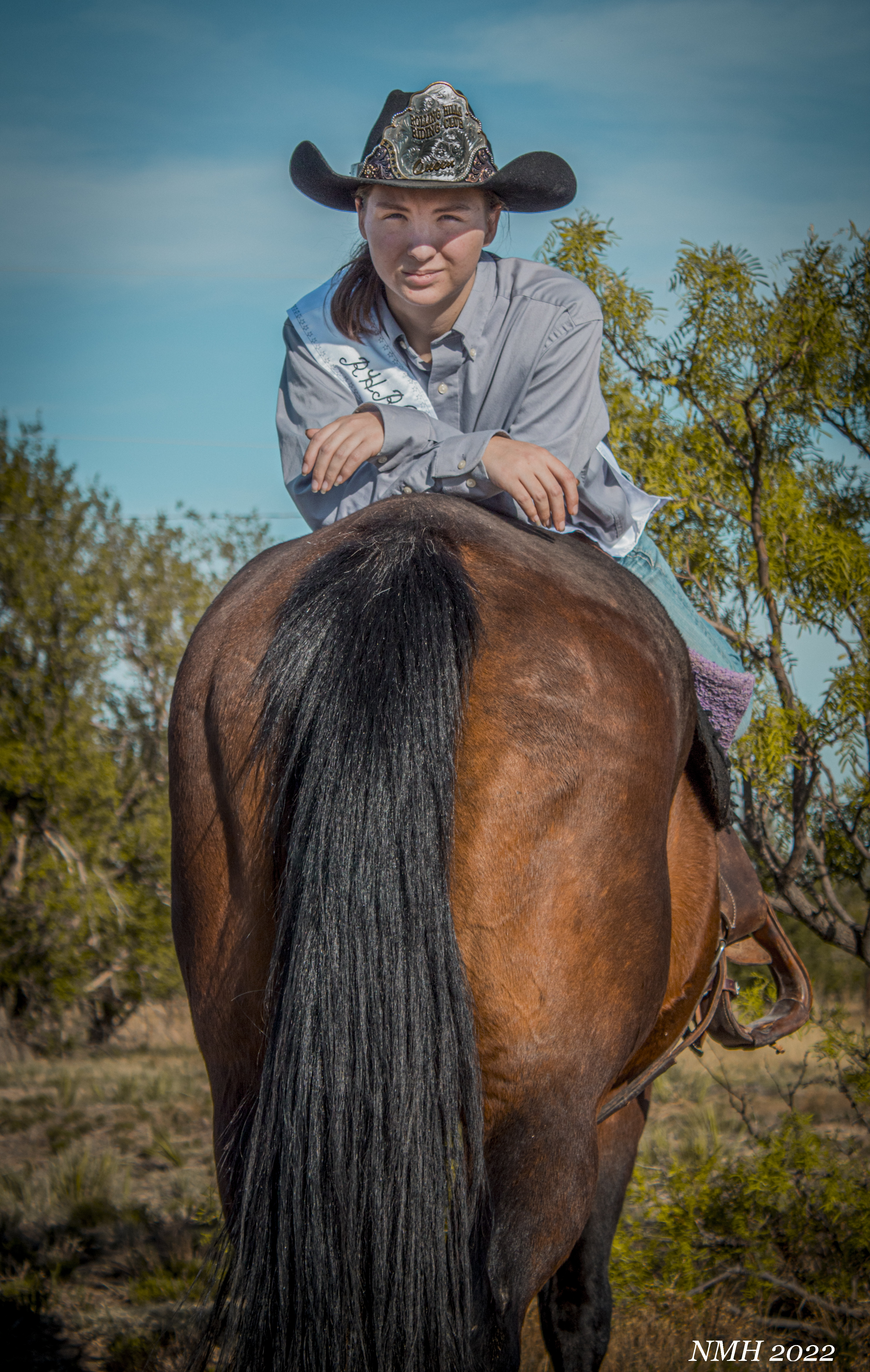 The things that were right about this session were, great subjects! She was eager to take some pictures, was comfortable and relaxed, and her horses were well behaved and easy to get into poses. The location suited the session as well. We had some farm equipment, some mesquites and a nice big elm tree for backgrounds the foreground was clutter free and we had a couple of hills and low spots to try and get level or below the subjects for a few interesting shots. I also think I captured her “true self”, I just let her be who she was. No forced smiles, we made a few suggestions on poses, and she took those suggestions and made them her own. You can tell she has a relationship with her horses, they are just as relaxed and easy going as she was. I ended up with quite a few photos where the horses’ eyes were closed because they were just chill.