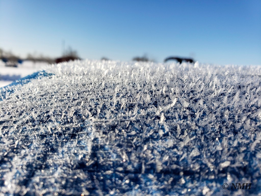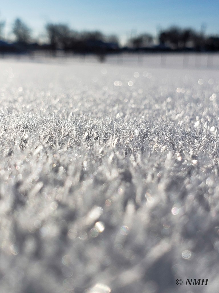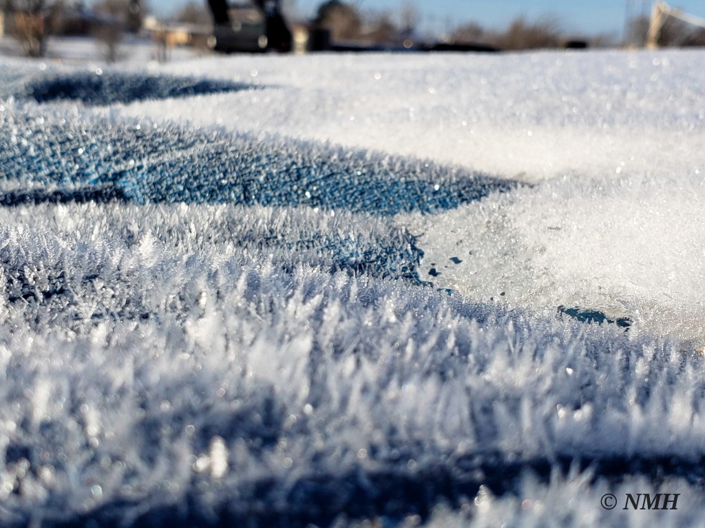 EIGHT WHOLE DAYS of below freezing temperatures! Most of us are not fans of cold weather, but I have learned to take the good with the bad, and while doing chores…I found this!!! In my opinion, this was the good part of the bad weather. This is not the first time it has happened, but these are some of the better pictures I have taken of it. In my pasture I have a mattress, covered in a tarp, for my horses to walk over, and when there is moisture in the air, these little fern-like-ice-tree-spikes form- (that’s the technical term for them <wink, wink>).