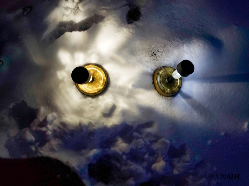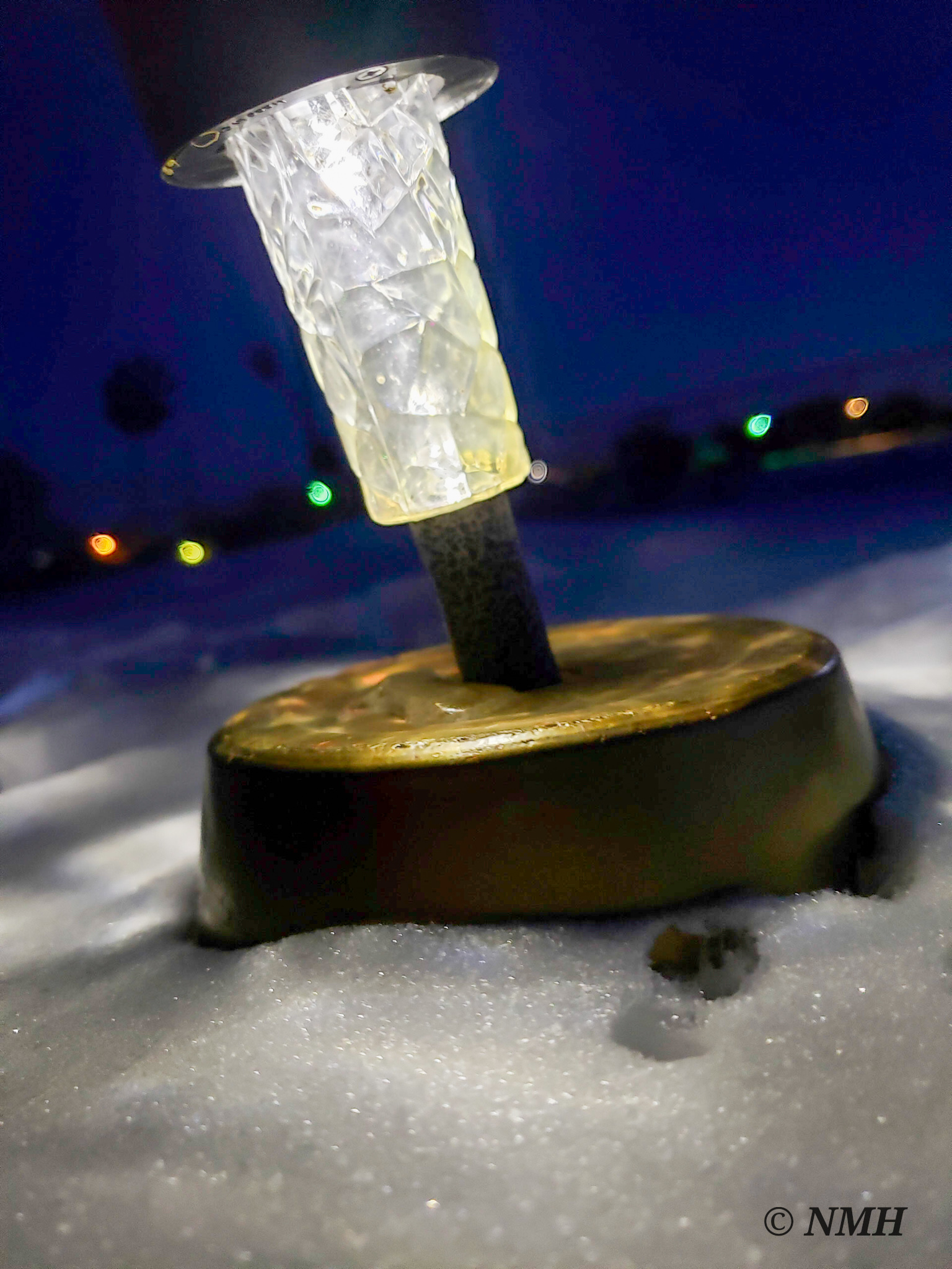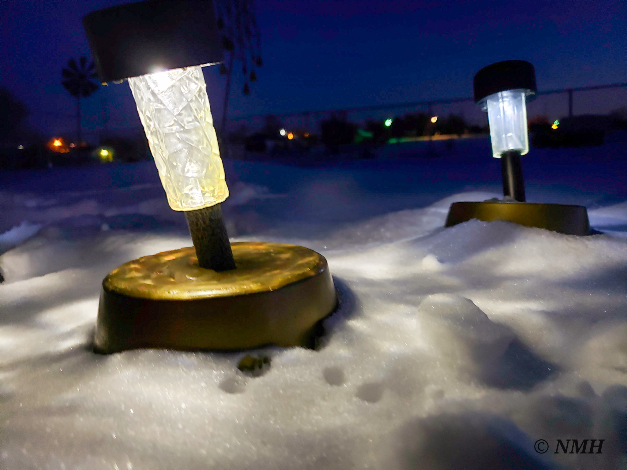 I can’t remember what I was walking outside to do, but things have a tendency of catching my eye. Great peripheral vision I suppose. This frigid winter evening I stepped out the back door to complete some chore, and the shadows the solar lights cast on the day old, glittery snow did just that, it caught my eye. I glanced back, saw the dusky purple sky, all the neighborhood lights. Perfect.